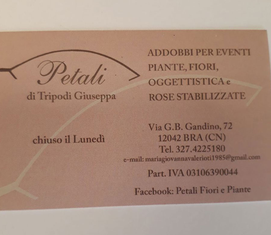 PETALI, è un negozio a gestione familiare, che esiste da 15 Anni. Grazie alla passione per il nostro lavoro, ci distinguiamo dagli altri fioristi per la lavorazione delle rose stabilizzate, che creiamo in maniera originale con svariate composizioni. Siamo altrettanto conosciuti, per le nostre targhette di legno personalizzabili, quindi siamo un negozio che va a caccia dell'originalità, per cercare di creare un regalo unico e inim...